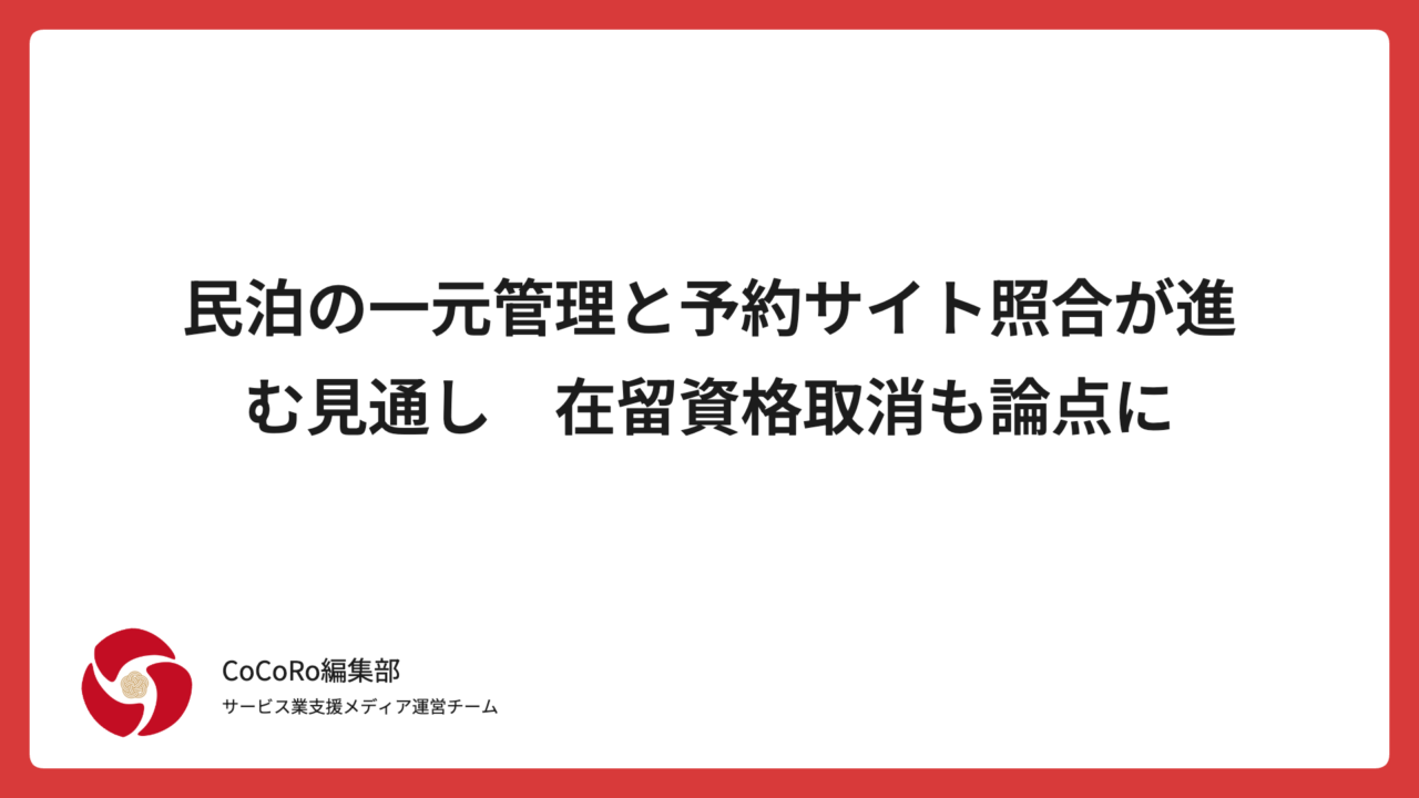 TAG 予約サイト 民泊の一元管理と予約サイト照合が進む見通し 在留資格取消も論点に 2025.12.25 宿泊・旅行業界ニュース CoCoRo編集部 CoCoRo 変なホテル コラボルーム戦略とは?宿泊業が学べる3つのポイント 2025.12.19 宿泊・旅行業界ニュース CoCoRo編集部 CoCoRo 富士青藍 全5室スモールラグジュアリーホテルが示す集客と高付加価値戦略 2025.12.19 宿泊・旅行業界ニュース CoCoRo編集部 CoCoRo ホテルインターゲート大阪 梅田のアートルームに学ぶ産学連携戦略 2025.12.12 宿泊・旅行業界ニュース CoCoRo編集部 CoCoRo 京町湯屋SOKOTOTOはなれで考える愛犬同伴ショッピングモール宿泊 2025.12.11 未分類 CoCoRo編集部 CoCoRo 氷のホテルで学ぶ冬の体験型宿泊づくり|トマム発・高付加価値化のヒント 2025.12.09 宿泊・旅行業界ニュース CoCoRo編集部 CoCoRo 宿泊業で働く人のための「重点支援DMO取組事例集」ガイド 2025.12.08 宿泊業界の課題と対策 CoCoRo編集部 CoCoRo 赤穂シーサイドパークグランピング春旅キャンペーンを宿泊業がどう活かすか 2025.12.02 宿泊・旅行業界ニュース CoCoRo編集部 CoCoRo グランピングリゾート熊本 吉無田に学ぶ、周年記念プランと地域誘客のポイント 2025.11.26 宿泊・旅行業界ニュース CoCoRo編集部 CoCoRo ホテルのグレードとチップの相場を徹底解説|金額の違いはどこで生まれる? 2025.11.05 チップ関連の知識系情報 CoCoRo編集部 CoCoRo 宿泊業界のDX成功事例まとめ!人手不足を補う5つのIT導入と職場改善のヒント 2025.08.25 人手不足・採用難 CoCoRo編集部 CoCoRo Ryokanとは?日本の伝統が詰まった“宿泊以上の体験” 2025.08.04 エッセイ CoCoRo編集部 CoCoRo